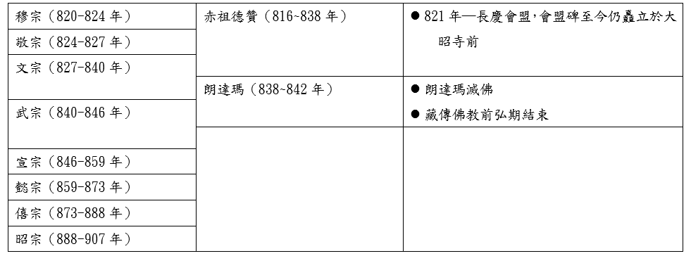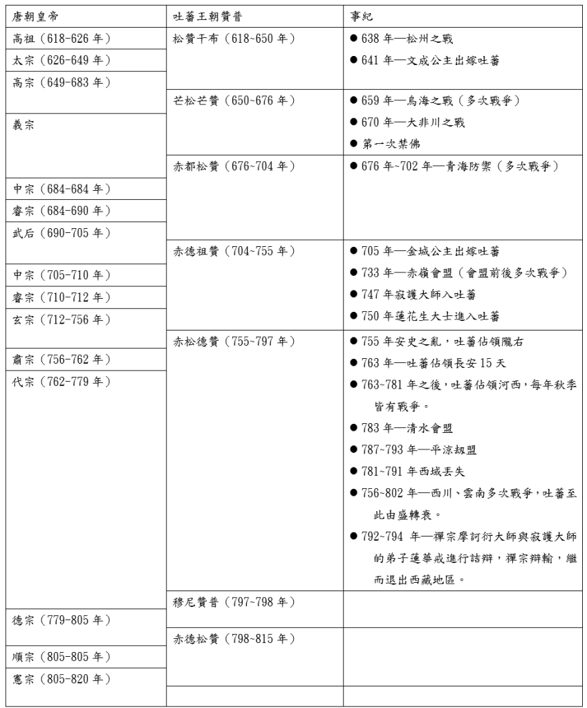 另外,整個吐蕃王朝在藏傳佛教史中,即是藏傳佛教的前弘期。藏傳佛教分為三個部份:前弘期、黑暗期和後弘期。前弘期是從尼泊爾赤尊公主和唐朝文成公主嫁給松贊干布,把佛教帶入吐蕃開始,結束於吐蕃王朝最後一任贊普朗達瑪滅佛。前弘期其實就是藏地原始的宗教─苯教和佛教爭鬥的過程,例如:在前弘期曾經發生過一次禁佛和一次滅佛,禁佛主要是因為芒松芒贊和赤都松贊皆為年幼即位,當時為貴族噶爾家族當權,該家族支持本教,所以佛教遭到排擠。後來赤德祖贊即位時,結束了噶爾家族主政,且迎娶大唐金城公主,後又有寂護大師入藏,佛教才又開始興盛,但本教在民間的勢力仍然不弱,才有了蓮花生大士入藏,降服苯教巫師的故事。 另外漢傳佛教也曾在這個時期進入西藏,781年有位禪宗法師摩訶衍來到吐蕃,傳教11年,信徒眾多,其中不乏有王宮貴族,使得寂護大師和蓮花生大師所建立的桑耶寺,其供養減少,後來桑耶寺邀請寂護大師的徒弟蓮華戒與摩訶衍進行辯經。摩訶衍主張頓悟成佛,而蓮華戒主張一步一步修行而證果,經過了三年辯經,赤松德贊認同蓮華戒的說法,禪宗落敗,甚至禁止禪宗傳法。而我們熟識的達賴、班禪喇嘛和紅教、白教、花教及黃教等教派,都是在後弘期逐漸發展出來的。黑暗期則是前弘期和後弘期之間(842-978年),佛教勢微的時期。