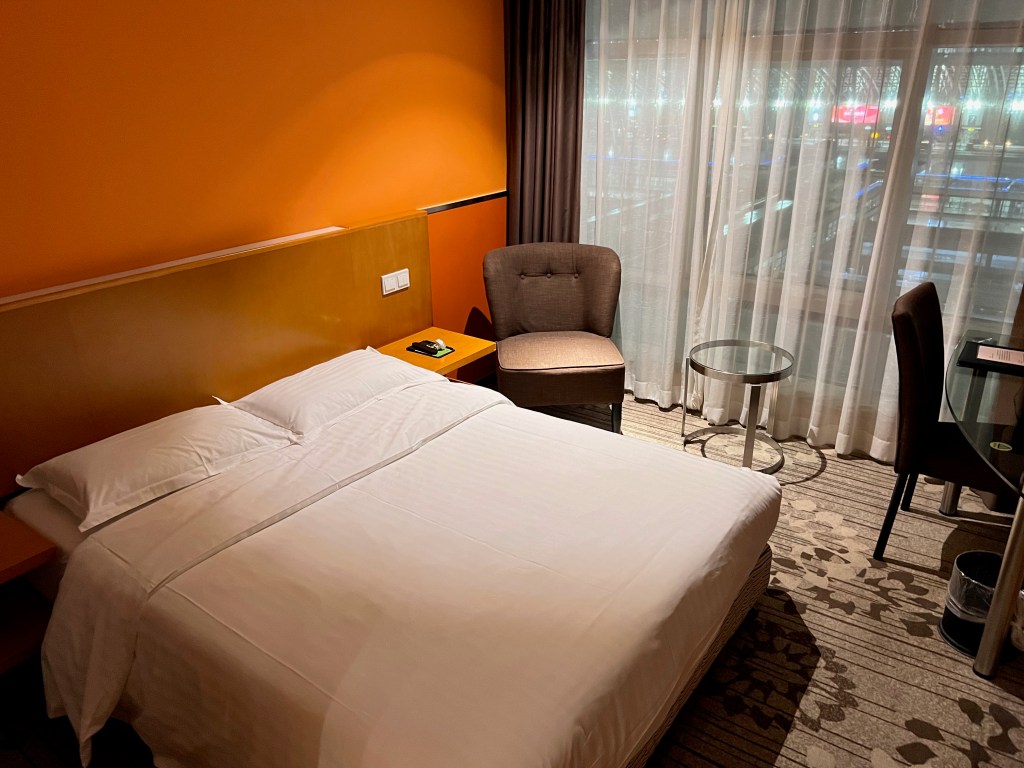 過了海關,領到行李箱已是六點多,本來還在思考是否有機會搭地鐵衝一波外灘,但看來會很趕。因為明天一早飛往拉薩貢嘎機場的飛機是六點,旅行社請我們四點集合,所以小魚建議我可以住在浦東機場第一和第二航站中間的住宿─大眾空港賓館。我在等領行李時,小魚還用line通話,關心我是否平安抵達,還提示我如何到達旅舍。大眾空港賓館的所在地,走幾步就到了,還滿方便的,而且我在Trip.com訂,一晚大約新台幣1500多元。我的房間不大,一間雙人大床,床很舒適,不軟也不硬,還有一張小桌子。窗外可以看到第一航站,只是燈光稍微昏暗。我安頓好行李,把一些證件收到老婆為我準備的貼身小包,綁在腰間,並用衣服遮蓋好,帶著房卡便外出覓食。賓館出口就是機場美食街,很多上海特色小吃,還有些在台灣沒見過的連鎖餐廳,例如:康師傅。我繞了一圈,沒有素食餐廳,我只好再往第二航站方向前進,找到了另一個美食街,竟然有台灣魯肉飯和永和豆漿,我才剛到,應該還沒有到思念家鄉味的情況,我只好再繞出來,走回原先的美食街。