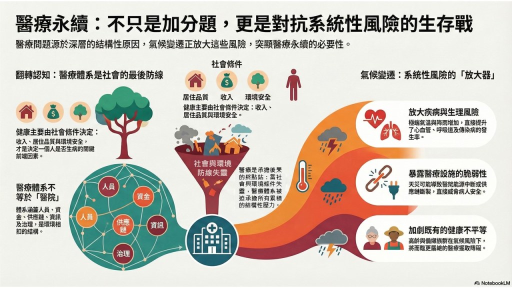 - 在氣候風險與社會不平等交織的時代,醫療體系究竟選擇被動承接後果,還是開始主動調整自身的角色與責任?