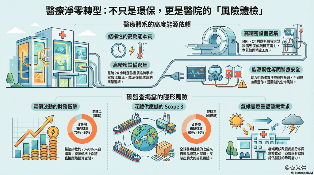 醫療的使命是守護生命,但支撐這份使命的,是一套龐大而持續運轉的能源系統。當外部環境不再穩定,當氣候與能源成為變動因素,我們才開始意識到:醫療體系本身,也是一個高度能源依賴的產業。