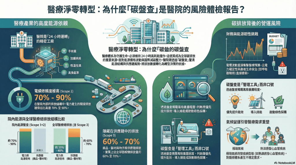 當能源價格波動、電力供應不穩、氣候變遷改變疾病型態,醫療體系所面對的已不只是環境責任,而是結構性的營運風險。碳盤查所揭示的,不僅是排放量的數字,更是一張能源依賴地圖,也是一份風險暴露清單。